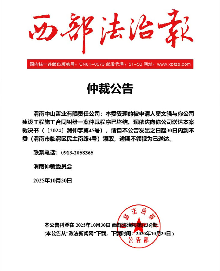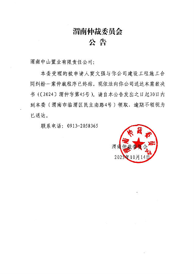 渭南中山置業(yè)有限責任公司與竇文強建設工程施工合同糾紛案公告
